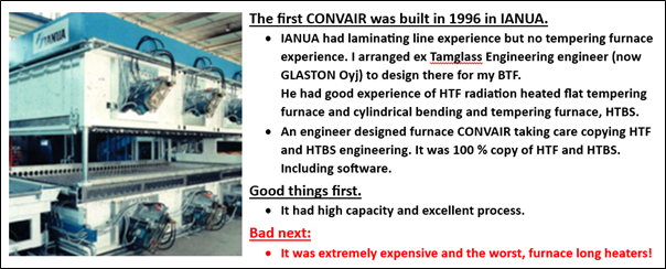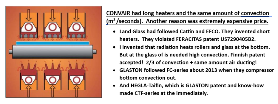 - Patent for CONVAIR was US 6470711B1 was wrong claimed! The claims should have been how to heat the convection air! Convection power was 5 kW/m² and heating power 80 kW/m². CONVAIR capacity was high. 5 mm clear glass was 26 loads/hour and triple silver glass at least 22 loads/hour. CONVAIR was supposed to be convection + radiation heating process. But was ”pure” convection heating furnace. It had effective convection air was heated once but no radiation. Then Tamglass Engineering did not know of short heaters. They were as long as the heating length.