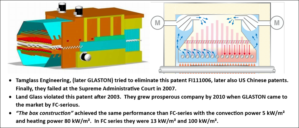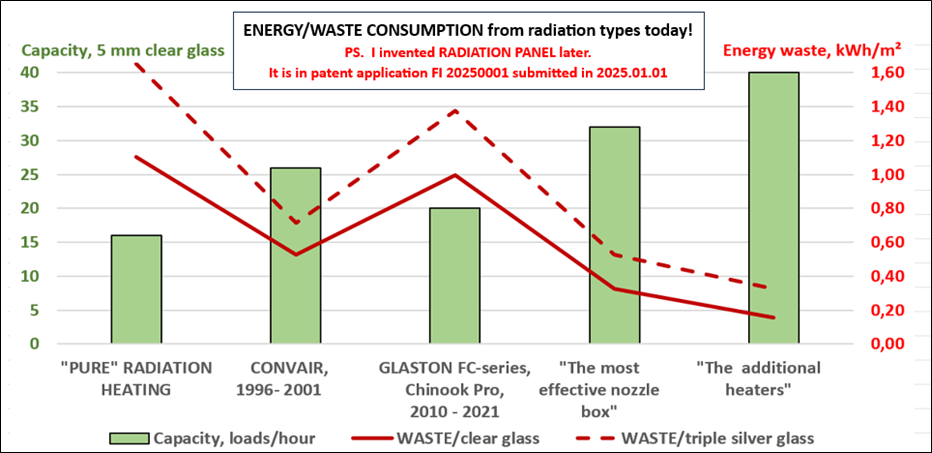 - In 2010 GLASTON tried to increase capacity even further by own development. It increased convection power to 13 kW/m² and heating power to almost 100 kW/m². It was a copy of RoboTemp and CONVAIR but with matrix heated convection air. In 2021, when I invented ”THE MOST EFFECTIVE NOZZLE BOX I informed GLASTON that their patent US8618442B2 eliminated convection heating and radiation. The capacity was reduced 30%.
